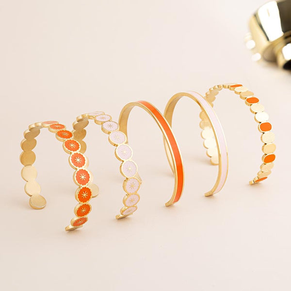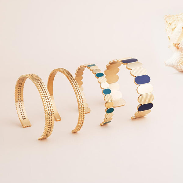 Les bracelets tendances pour femme Louise Garden incarnent l’ADN de notre maison créative. Designs inspirés par la nature et qui qui reprennent les couleurs à la mode, une taille unique qui s'ajuste à chaque taille de poignet, acier inoxydable pour se baigner avec, légèreté et confort. Surfaces martelées ou textures inspirées des éléments naturels composent des pièces distinctives, à l'image du bracelet jonc doré Aurore pour femme en acier inoxydable. Ces bijoux colorés pour femme peuvent se porter seuls pour un effet épuré ou combinés à d’autres créations pour une silhouette plus affirmée. Ces pièces signatures reflètent une vision du bijou : durableet et identifiable. Une signature Louise's Garden de style bohème chic.