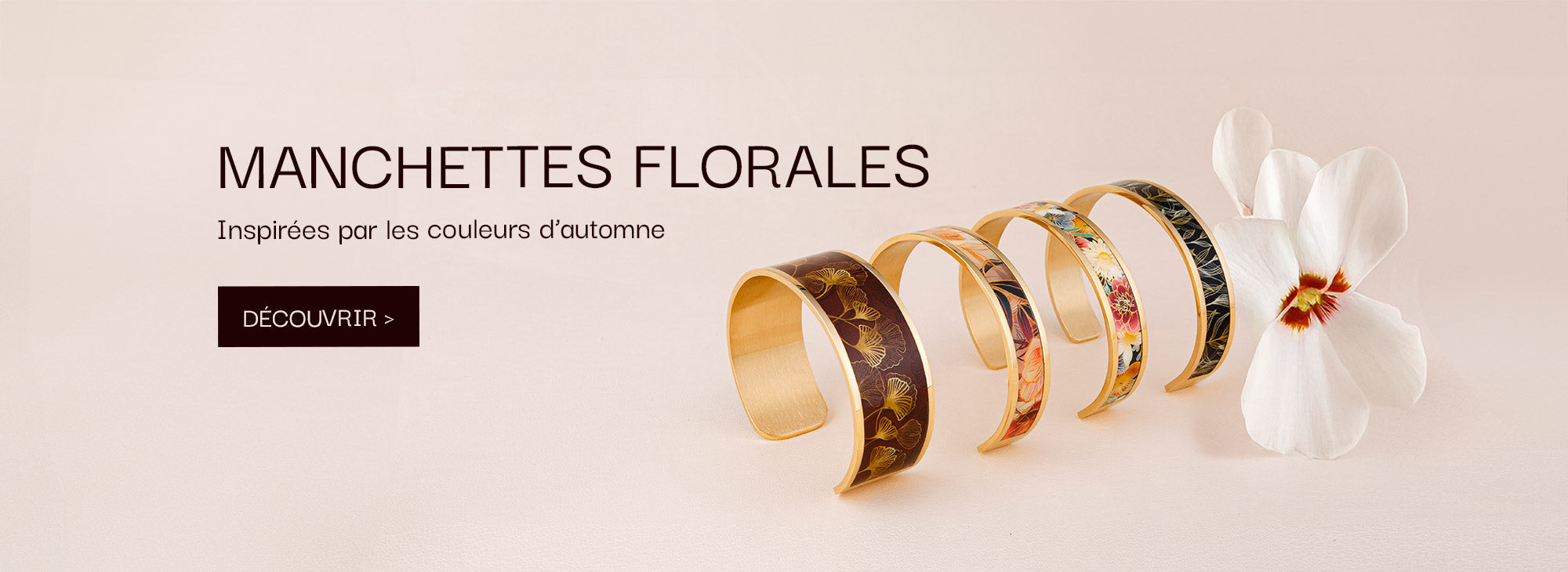 Pour celles qui apprécient les bracelets bohème chic, notre marque française vous propose des manchettes fleurs de lys, cerisier du japon, sakura, poinsettia. Nos accessoires de mode en acier inoxydable sont dépourvus de nickel. Cette année, le jonc bracelet tressé pour femme en acier inoxydable ainsi que la manchette fleur japonaise se portent avec une longue robe noire ou marron chocolat de style bohème chic. Chaque modèle de manchette en acier inoxydable respecte la sensibilité des peaux les plus fragiles. Les imprimés fleuris et végétaux des bracelets fleurs sont recouverts d'un vernis assurant brillance et longévité. Trouvez l'idée de look bohème avec des bijoux fantaisie pour femme sur notre blog. Craquez pour le design nature des joncs dorés parmi notre sélection de manchettes fleurs.